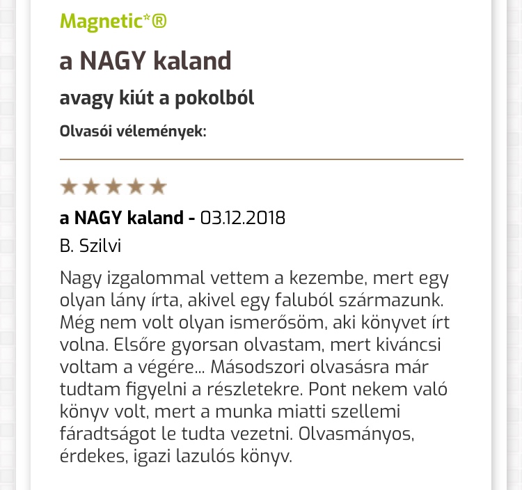 Hát, ez is elérkezett, megjelent a NAGY kaland - avagy kiút a pokolból - című könyvem. Kicsit megcsúsztam ezzel a blog bejegyzéssel is, igazából nem volt bennem semmi késztetés, hogy megírjam. 😳 Valahogy nem találtam, vagy találom (?) a szavakat. Csak olyan ürességet érzek most ezzel kapcsolatban. Mert ez is olyan emberi gyarlóság, hogy addig...